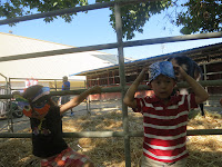 I love fairs, I really do. We used to go to the NC state fair every year and loved it. Since I've moved to SF, I've always wanted to make the trek up to Sacramento to the CA stat fair. Since I had such success with the kids on outings thus far in our summer, I thought I would give it a shot. I talked to my friend Emily in Sac, who has 4 year old triplets and they go every year, to see if it's something I could handle on my alone with the twins. She gave me a few pointers, worked her schedule out to meet us there and we were off! Timo and Cameron were excited to see their old pals Fletcher, Baily and Parker!